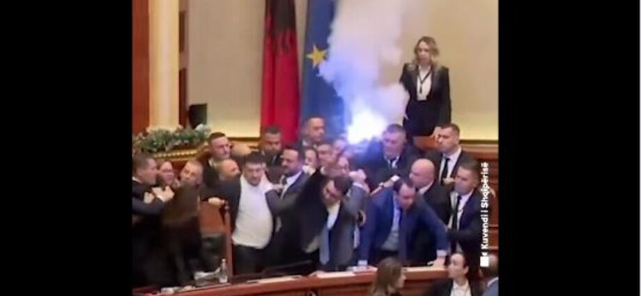 Αρχική / Κόσμος Χάος στην αλβανική βουλή: Βουλευτές συγκρούστηκαν με αστυνομικούς, πέταξαν νερό στον πρόεδρο – Δείτε βίντεο Bουλευτές άναψαν φωτοβολίδες, πέταξαν νερό στον πρόεδρο της Βουλής και πήραν θέση σε έδρανα που προορίζονται για υπουργούς της κυβέρνησης