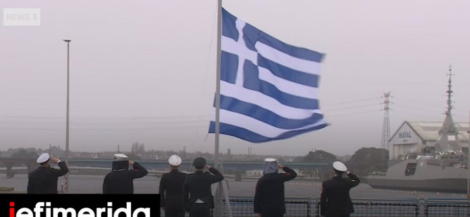 Ολοκληρώθηκε η τελετή ονοματοδοσίας και έπαρσης της ελληνικής σημαίας στη φρεγάτα «Κίμων», στα ναυπηγεία Λοριάν στη Γαλλία.