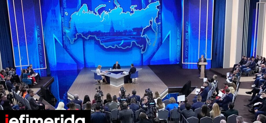 Ο σχεδιασμός του τηλεοπτικού σκηνικού στη συνέντευξη Τύπου του Βλαντίμιρ Πούτιν στέλνει ένα σαφές μήνυμα στην Ουκρανία.