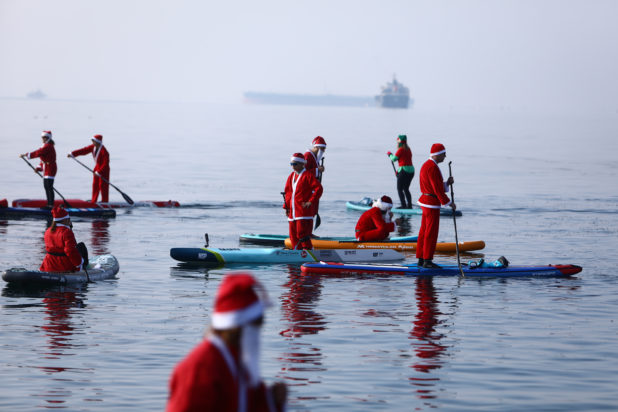 Δεκάδες «Αγιοβασίληδες» με σανίδες SUP βρέθηκαν στην παραλία της Θεσσαλονίκης για να συμμετάσχουν στο 5ο Santa SUP, στα νερά του Θερμαϊκού Κόλπου.