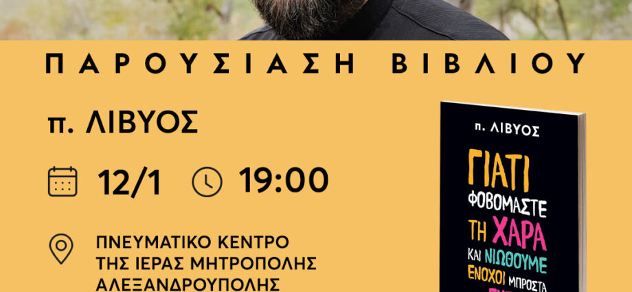 Το βιβλίο του “Γιατί φοβόμαστε τη χαρά και νιώθουμε ένοχοι μπροστά στην ευτυχία;” θα παρουσιάσει στην Αλεξανδρούπολη ο π. Χαράλαμπος Παπαδόπουλος, γνωστός ως π. Λίβυος. Η εκδήλωση θα πραγματοποιηθεί τη Δευτέρα 12 Ιανουαρίου 2026 στο Πνευματικό Κέντρο της Ιεράς Μητρόπολης Αλεξανδρούπολης στις 19:00, από τις εκδόσεις Ψυχογιός και το βιβλιοχαρτοπωλείο Βαταμίδη. Συμμετέχει ο ψυχολόγος Στράτος Βραχιώλιας.