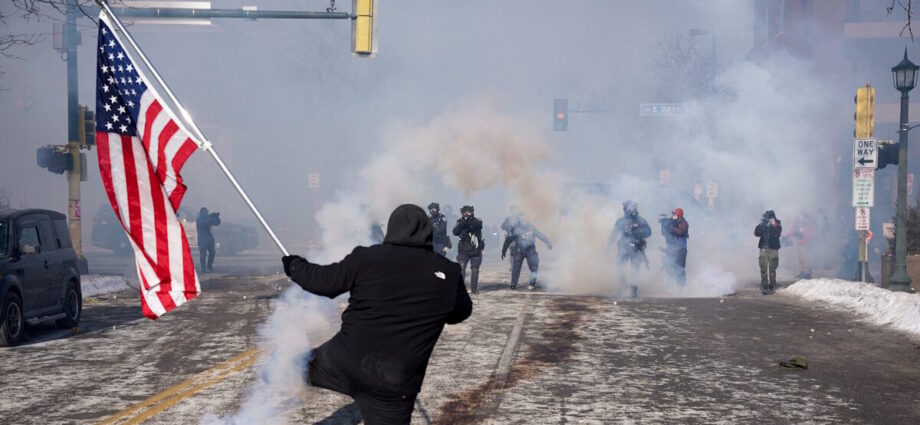 Ένα άτομο κρατά μια αμερικανική σημαία κατά τη διάρκεια συγκρούσεων μεταξύ ομοσπονδιακών πρακτόρων και μελών της κοινότητας στο σημείο όπου ομοσπονδιακοί πράκτορες πυροβόλησαν θανάσιμα έναν άνδρα ενώ προσπαθούσαν να τον συλλάβουν, στη Μινεάπολη της Μινεσότα / REUTERS/Seth Herald