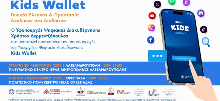 H εφαρμογή Kids Wallet: Kids Wallet: Γονικός έλεγχος & Προστασία Ανηλίκων στο Διαδίκτυο θα παρουσιαστεί στον Έβρο. Οι εκδηλώσεις θα γίνουν στην Αλεξανδρούπολη, την Τετάρτη 28 Ιανουαρίου, στις 18:00, στο Πνευματικό Κέντρο Ιεράς Μητροπόλεως και στην Ορεστιάδα την Πέμπτη 29 Ιανουαρίου στις 17:30, στο Πολιτιστικό Πολύκεντρο Νέας Ορεστιάδας.