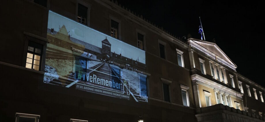 Φωταγωγήθηκε η πρόσοψη του Μεγάρου της Βουλής των Ελλήνων στο πλαίσιο της Διεθνούς Ημέρας Μνήμης του Ολοκαυτώματος, με το θεματικό λογότυπο της διεθνούς εκστρατείας #WE REMEMBER.
