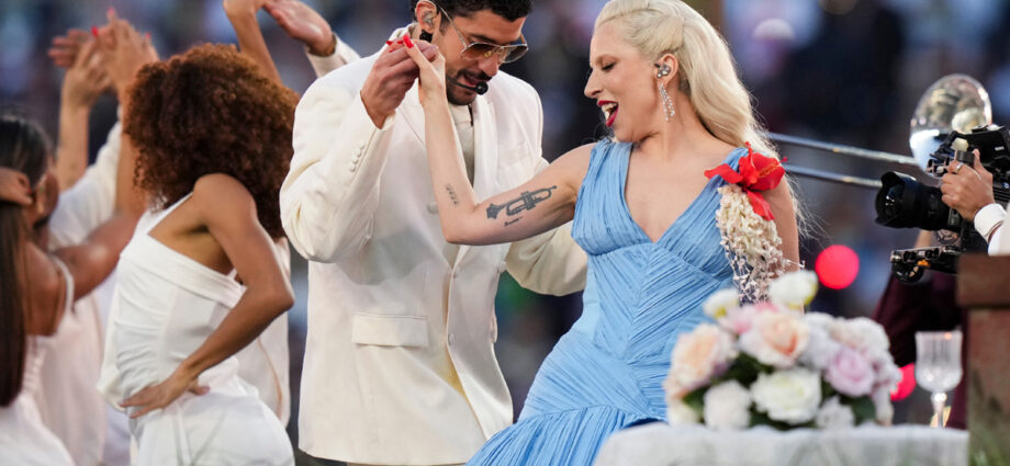 Gaga made a surprise appearance in the middle of Bad Bunny’s halftime set to sing “Die With A Smile.”