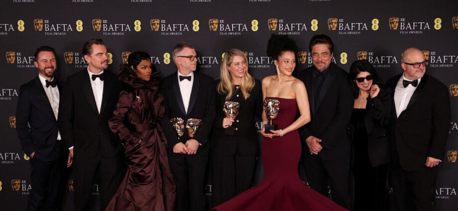 Ο σκηνοθέτης Paul Thomas Anderson και οι ηθοποιοί Leonardo DiCaprio, Benicio Del Toro, Teyana Taylor, Chase Infiniti ποζάρουν με τα βραβεία Καλύτερης Ταινίας, Καλύτερου Σκηνοθέτη και Καλύτερου Διασκευασμένου Σεναρίου για την ταινία «One Battle After Another» στα Βραβεία της Βρετανικής Ακαδημίας Κινηματογράφου και Τηλεόρασης (BAFTA) 2026 / REUTERS / Φωτογραφία Suzanne Plunkett