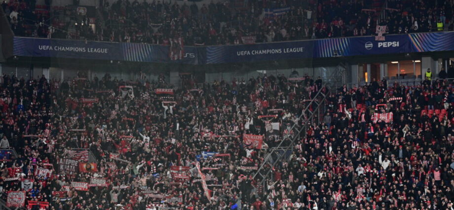 Οι οπαδοί του Ολυμπιακού δεν σταμάτησαν να τραγουδούν καθ’ όλη τη διάρκεια του αγώνα και κέρδισαν κατά κράτος τη μάχη της εξέδρας… Πηγή