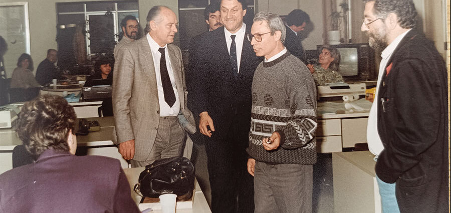 Αίθουσα σύνταξης ΕΡΤ επίσκεψη υπουργού Βύρωνα Πολύδωρα – Αρχείο Πέτρου Κοντραφούρη