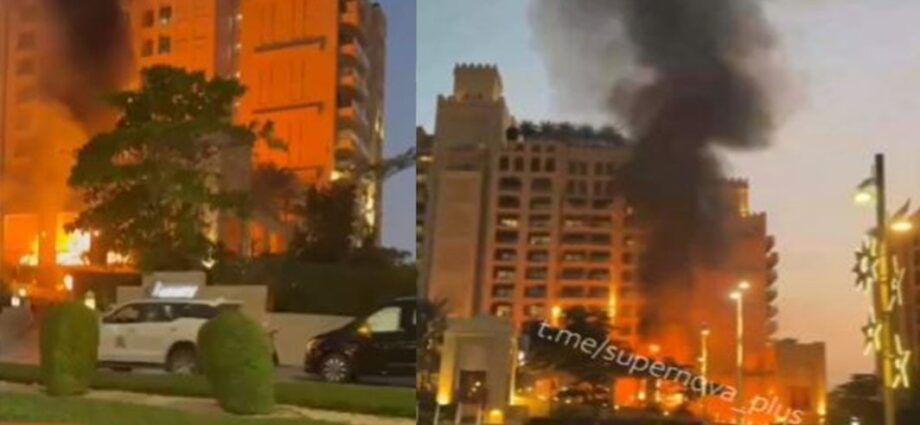 Μια πυκνή στήλη καπνού υψώθηκε στον ουρανό της περιοχής, ενώ όπως φαίνεται σε βίντεο που κάνουν τον γύρο των social media διακρίνεται να έχει ξεσπάσει φωτιά στην είσοδο ενός ξενοδοχείου.