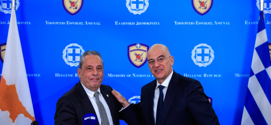 Στιγμιότυπο από τη συνάντηση του υπουργού Εθνικής Άμυνας, Νίκο Δένδια, με τον ομόλογό του της Κυπριακής Δημοκρατίας, Βασίλη Πάλμα, τον Ιανουάριο του 2024 (Πηγή φωτογραφίας: ΓΙΩΡΓΟΣ ΚΟΝΤΑΡΙΝΗΣ / EUROKINISSI)