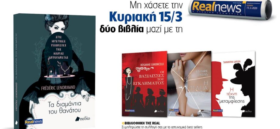 Αυτή την Κυριακή δύο βιβλία με τη Realnews: Στις μυστικές υπηρεσίες της Μαρίας Αντουανέτας – Τα διαμάντια του θανάτου, του Frédéric Lenormand – Μαζί αστυνομικά best sellers Enikos Newsroom 18:09, Σάββατο 14 Μαρτίου 2026 Media Αυτή την Κυριακή δύο βιβλία  με τη Realnews: Στις μυστικές υπηρεσίες της Μαρίας Αντουανέτας – Τα διαμάντια του θανάτου, του Frédéric Lenormand, μαζί αστυνομικά best sellers