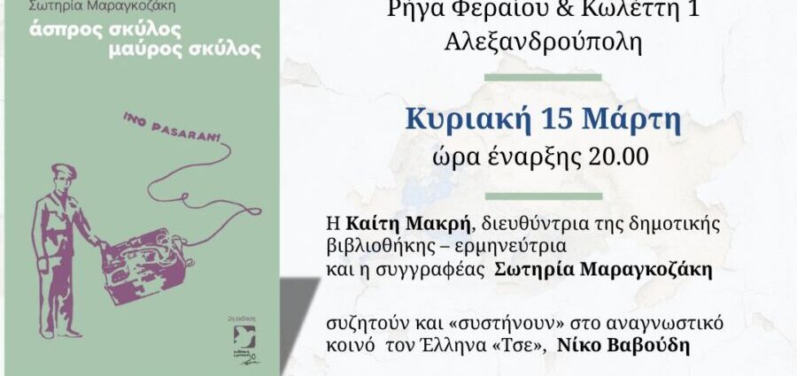Την Κυριακή 15 Μαρτίου στις 8μμ στην Αλεξανδρούπολη παρουσιάζεται για πρώτη φορά η 2η βελτιωμένη έκδοση του βιβλίου στο καφε μπαρ/ βιβλιοπωλείο AZADI σε μια ξεχωριστή εκδήλωση. Η Καίτη Μακρή, διευθύντρια της Δημευτικής Βιβλιοθήκης ερμηνεύτρια και η συγγραφέας Σ. Μαραγκοζάκη συζητούν και συστήνουν στο κοινό τον Ελληνα «Τσε» Νίκο Βαβούδη. Μέσα… Πηγή