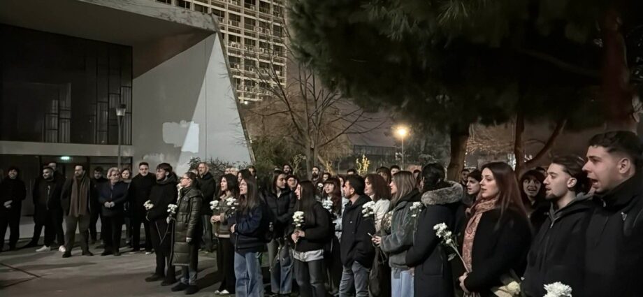 Συγκέντρωση στη μνήμη των 57 θυμάτων της τραγωδίας των Τεμπών που συνέβη πριν από τρία χρόνια και συγκλονίζει ακόμη και σήμερα, πραγματοποίησαν φοιτητές στα γρασίδια της Φιλοσοφικής Σχολής του Αριστοτέλειου Πανεπιστημίου Θεσσαλονίκης.