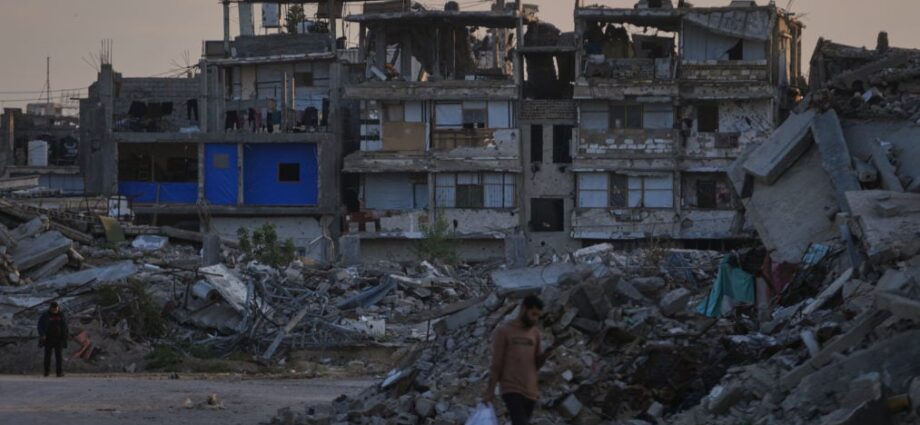 Παλαιστίνιοι περπατούν σε έναν δρόμο περιτριγυρισμένοι από κτίρια που καταστράφηκαν κατά τη διάρκεια ισραηλινών αεροπορικών και επίγειων επιχειρήσεων στο Χαν Γιουνίς, στη νότια Λωρίδα της Γάζας, Πέμπτη 9 Απριλίου 2026. (AP Photo/Abdel Kareem Hana)