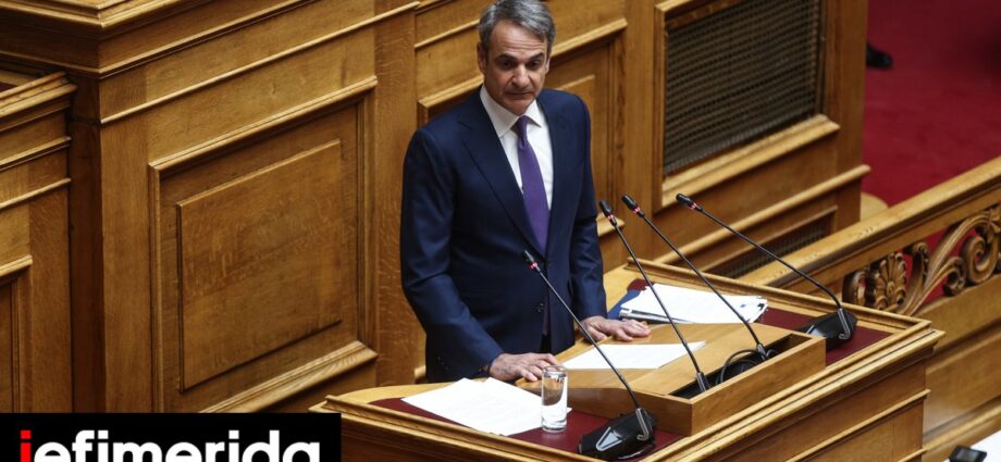 Στο βήμα της Ολομέλειας της Βουλής ο Κυριάκος Μητσοτάκης / Φωτογραφία: Dimitris Kapantais / SOOC