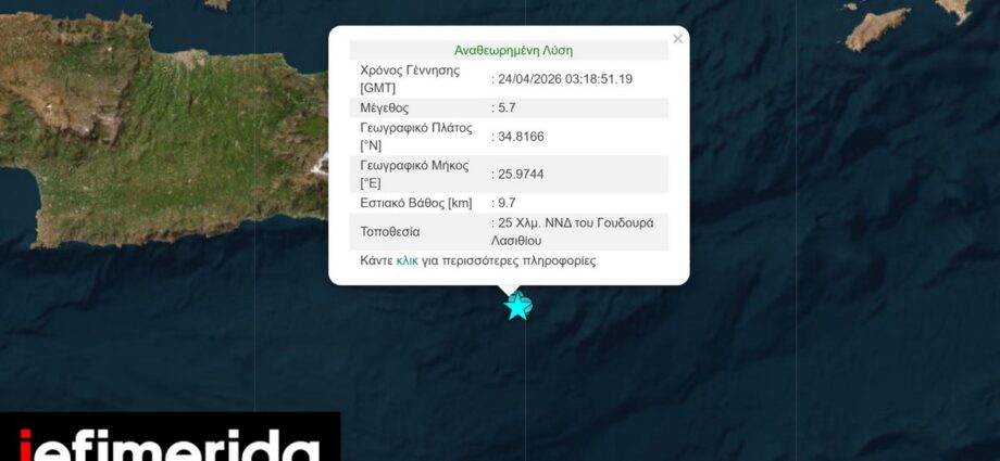 Νωρίτερα, η Αυτόματη Λύση του του Γεωδυναμικού Ινστιτούτου, έδωσε τον σεισμό στα 5,5 Ρίχτερ και 7χλμ ΒΔ του Γουδουρά Λασιθίου.