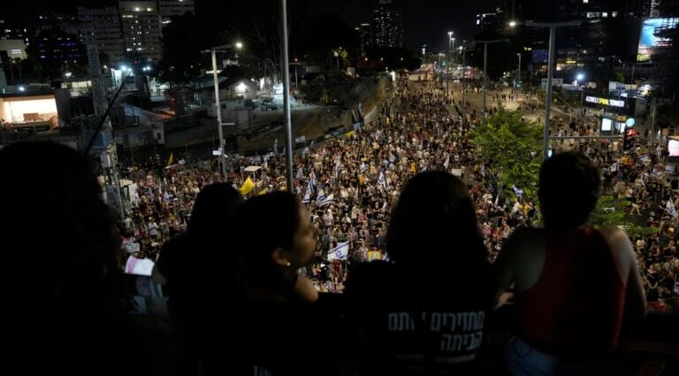 Relatives of hostages held by Hamas in the Gaza Strip and their supporters call for the immediate release of hostages held by the militant group, and protest against Israeli Prime Minister Benjamin Netanyahu’s government in Tel Aviv, Israel, Saturday, Aug. 10, 2024. (AP Photo/Mahmoud Illean)
