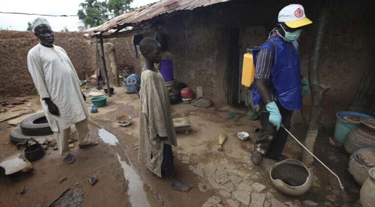 In this Monday, Sept. 6, 2010 photo, Salisu Garba, left, looks on as a healthcare worker sprays Garba’s home with a chlorine solution designed to kill cholera bacteria, in Ganjuwa in Nigeria’s rural Bauchi State. Health officials, some with surgical masks covering their faces, sprayed anti-bacterial solution on muddy paths in this village, and patients jammed into rudimentary clinics as the government struggled to contain a cholera epidemic that has killed nearly 800 people in two months. The worst epidemic in Nigeria in 19 years is spreading to Cameroon, Chad and Niger, where it has killed hundreds more people. (AP… Πηγή